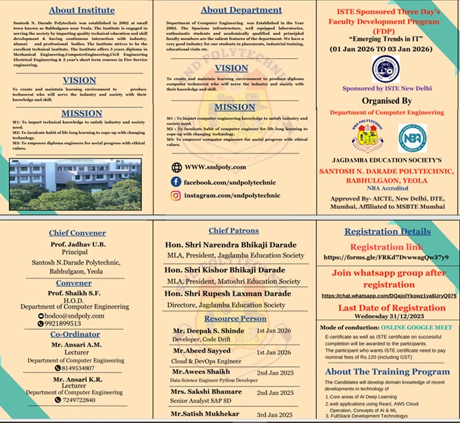 Santosh N Darade Polytechnic offers an exceptional opportunity for students to build a strong foundation in engineering and technical education. With modern infrastructure, state-of-the-art laboratories, and expert faculty, the college provides a hands-on learning experience that bridges the gap between theory and practical application. Our programs in Civil, Computer, Electrical, and Mechanical Engineering are designed to equip students with the skills and knowledge needed to succeed in the ever-evolving technical landscape.